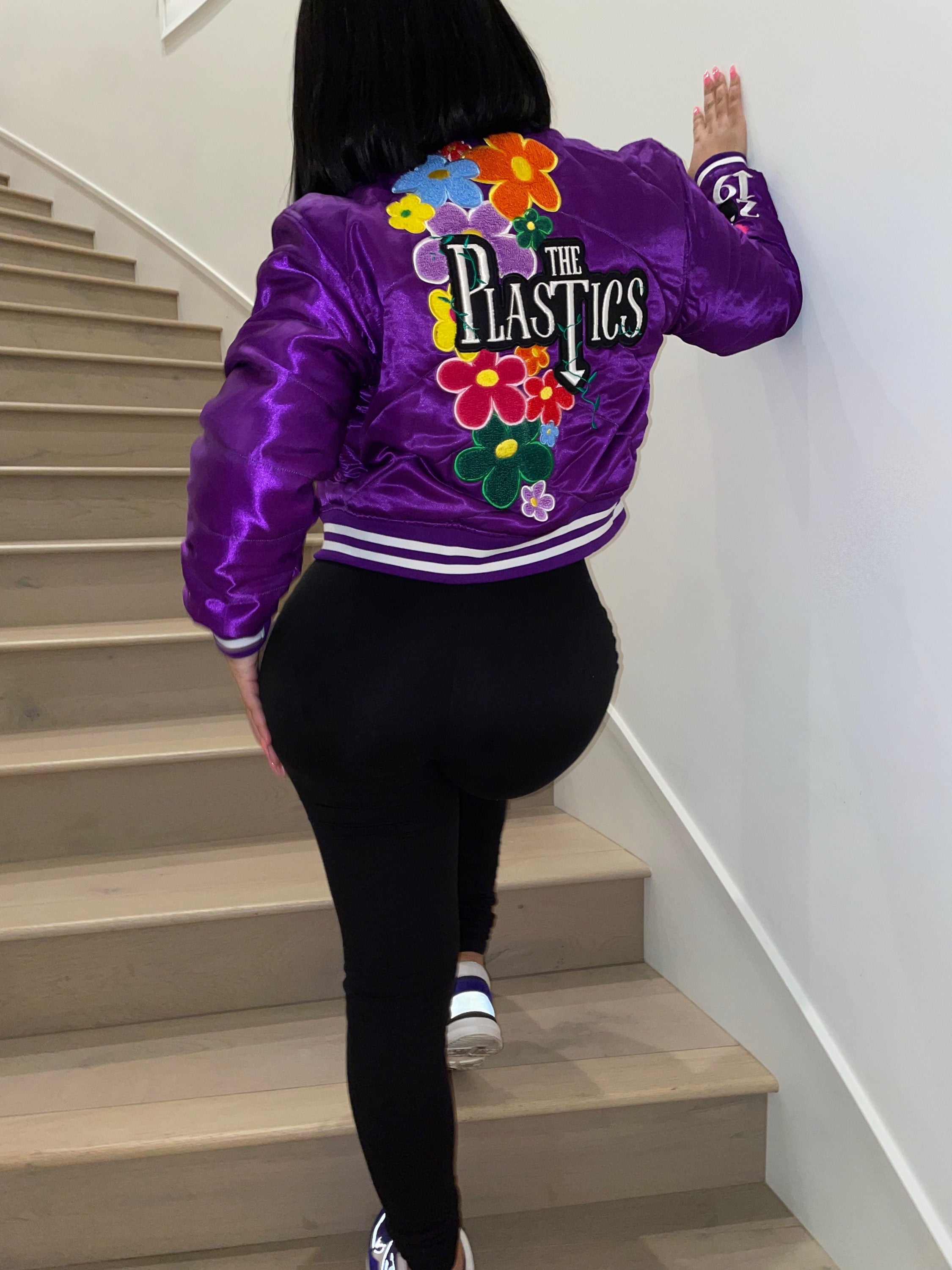 Modelo morada con talla mediana para un look oversize